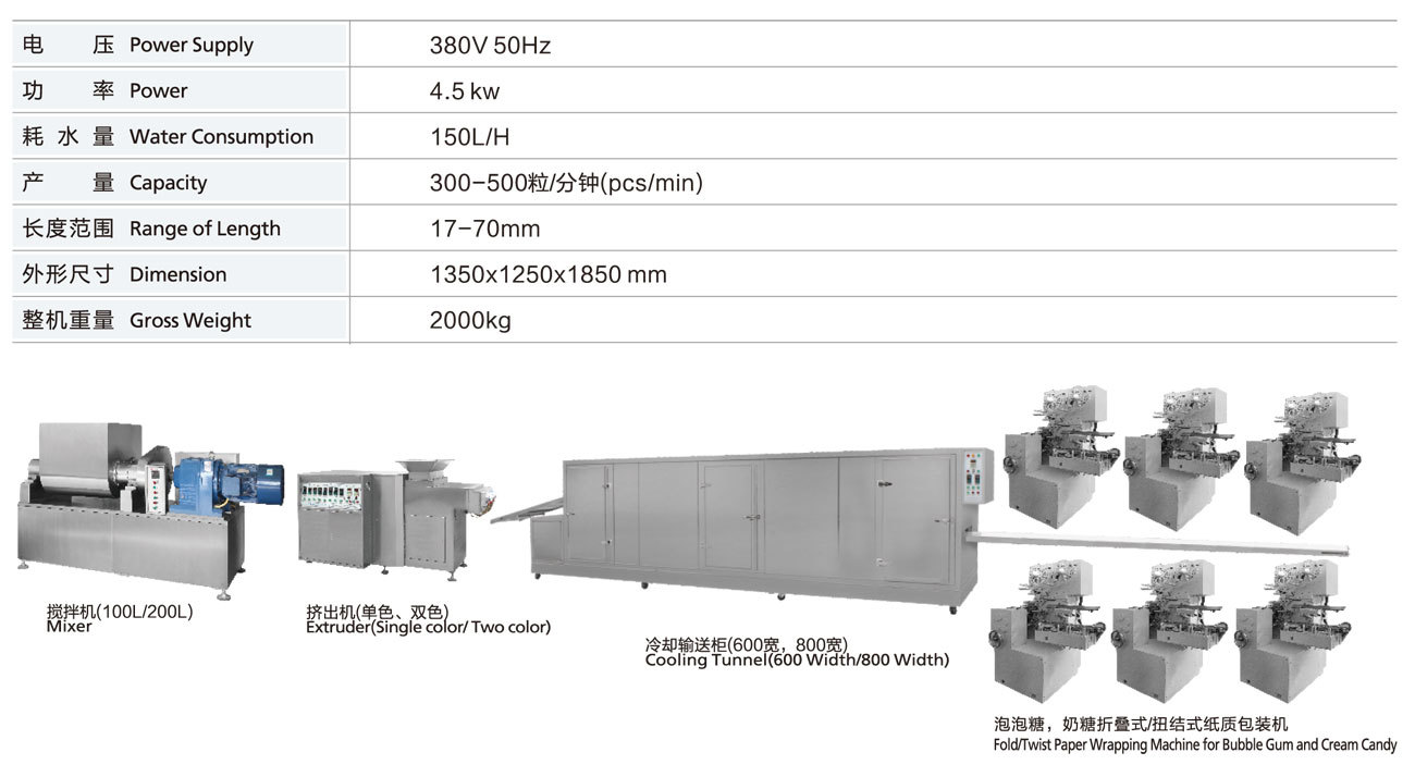 Bubble gum and cream candy is the line from extruder, cooling tunnel go through this machine which is forming again, auto cutting and fold wrapping. To change the mould box to be twist wrapping form.t features of function that no candy feeding, paper will not feed. When candy sticky, machine will stop automatic, color mark will track automatic etC. It also can wrap double layers Wax paper.