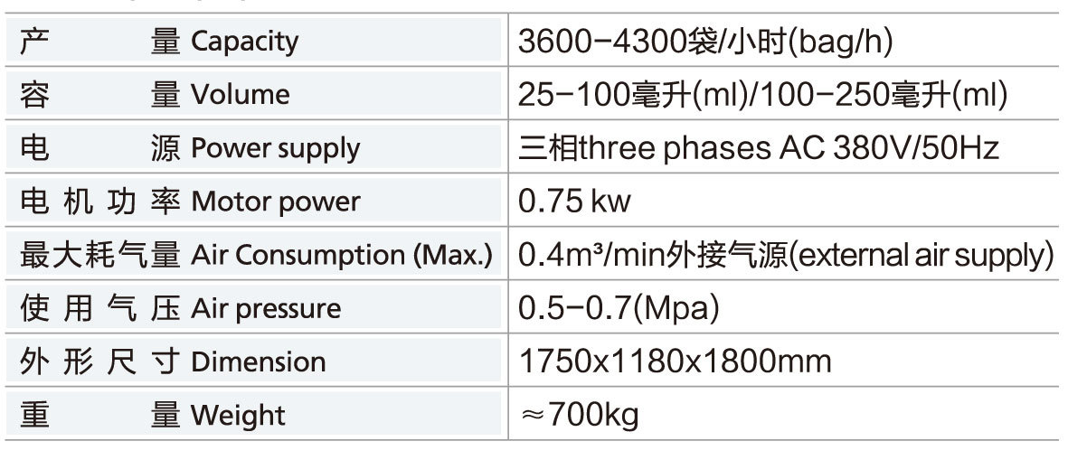 Specially used for filling and lid-tightening of standing pouch, it integrates mechanism, electricity and pneumatic together. Except of manual bag hanging, it is automatically in the whole process from open the bag, filling, cleaning, putting, tightening and discharging. It features of accurate quantitative, compact tightening, good quality.