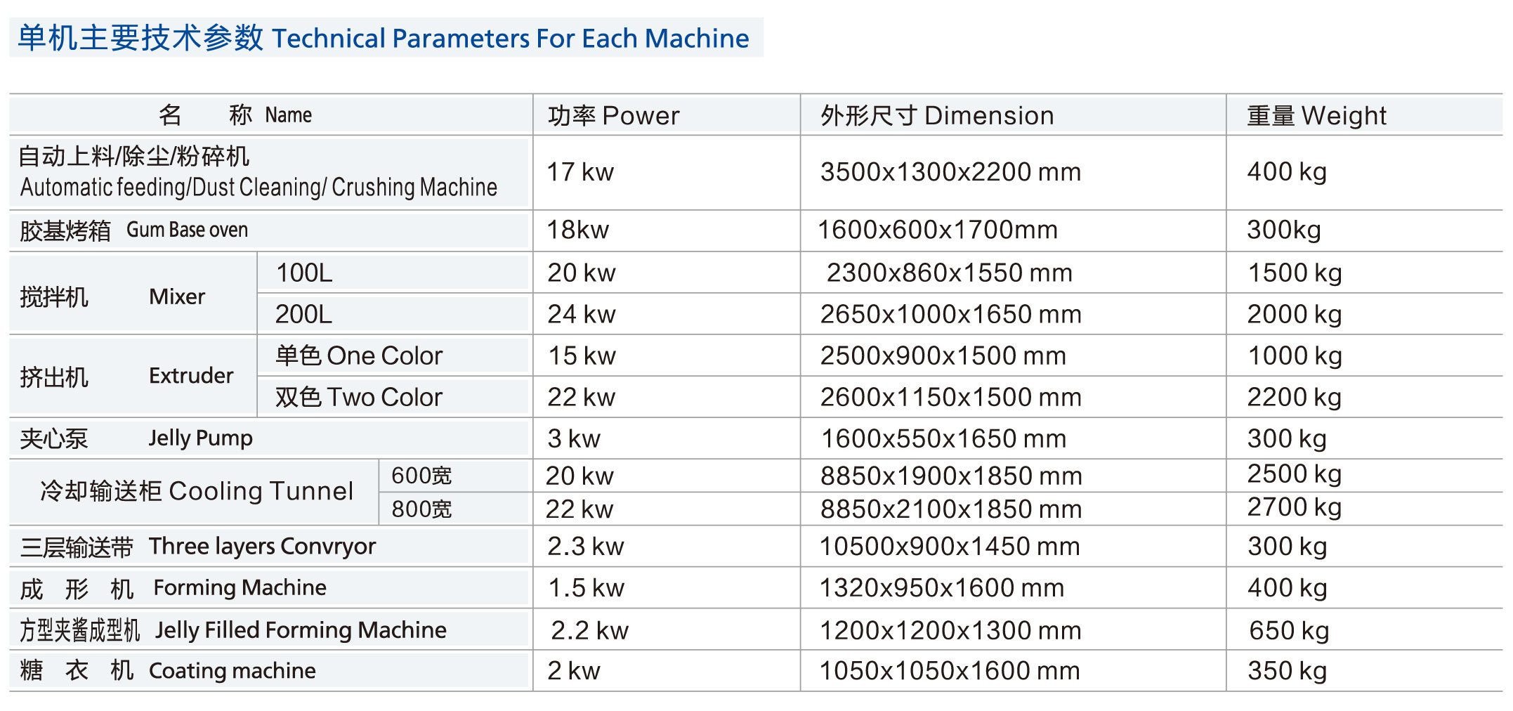 It is suitable for producing cream candy and bubble gum with all kinds of shaped. This production line is composed by mixer, extruder, cooling tunnel/3 layers conveyor, forming machine (6 sets), coating machine, jelly filled forming machine and gum base oven. It can be produced hollow, powder fllig or jelly flling candy in the shapes of balls, strawberry, oval, column, and so on.